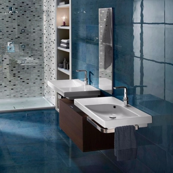 De dynamiske linjer og formen af håndvasken skaber nye muligheder i badeværelset, hvor hjørner ofte ikke kan udnyttes optimalt.