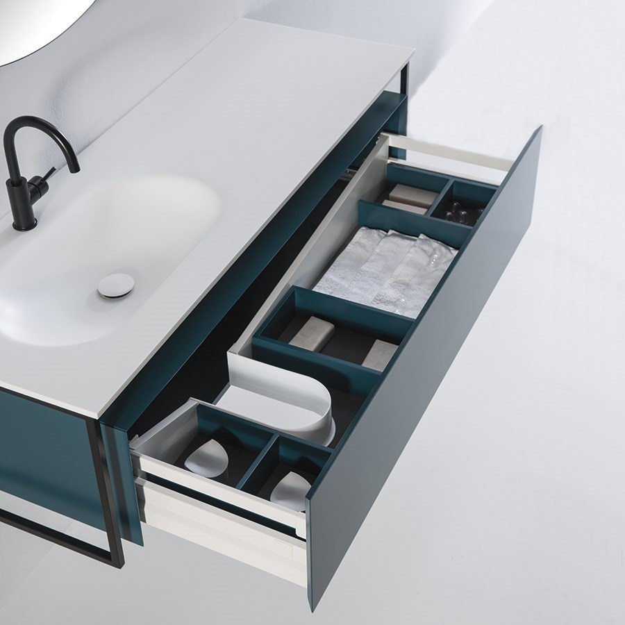 Badeværelsesmøbel med sort stålramme og smukt lakeret skab