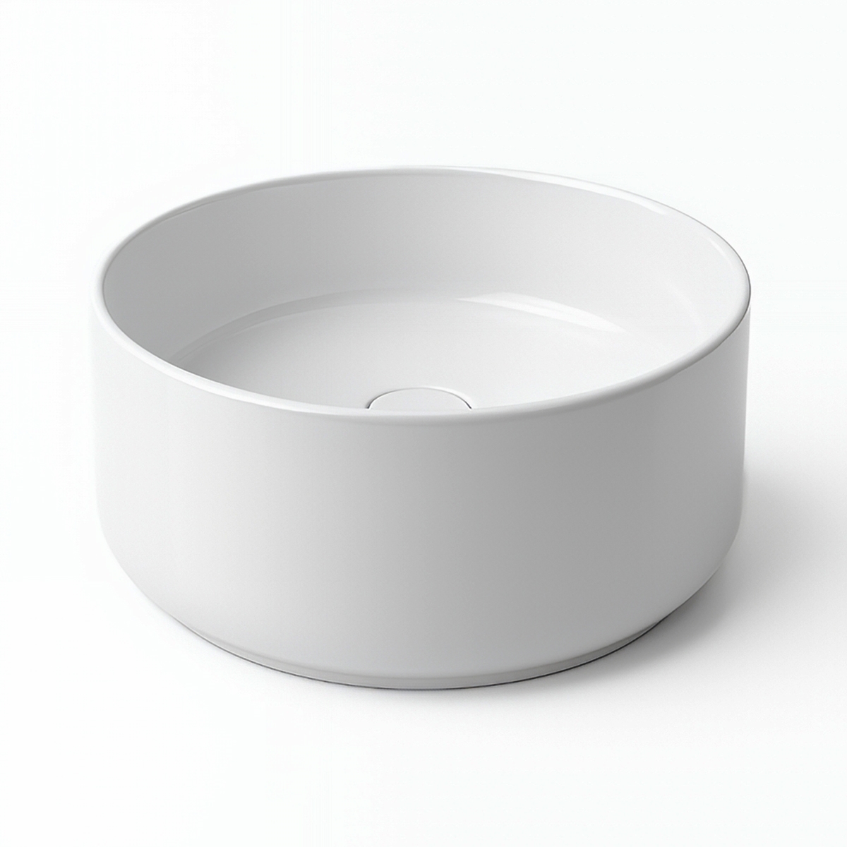 Denne runde håndvask er anderledes end andre runde vaske, da den har en højde på 17,5 cm. Kanten er tynd hele vejen rundt, hvilket giver håndvasken et let og enkelt udtryk.