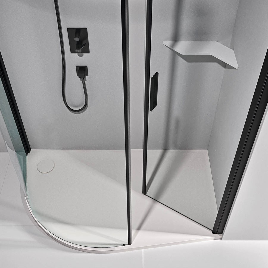 I prisen er inkluderet følgende: Brusebund i et lækker Solid Surface materiale, samt buet bruse afskærmning med dør, alt i 8 mm. hærdet sikkerhedsglas.
