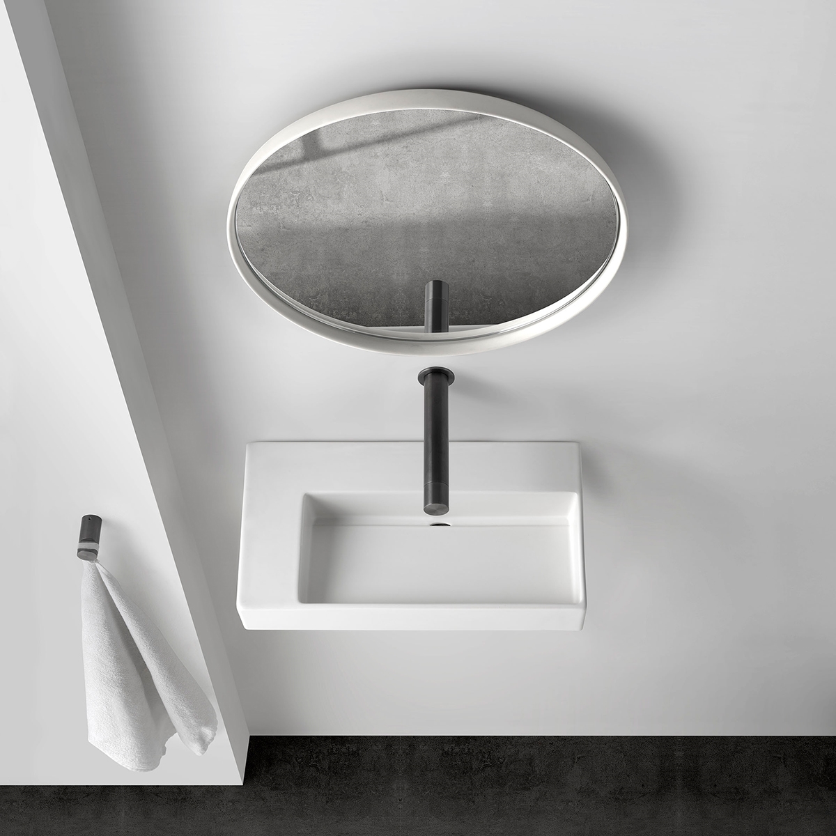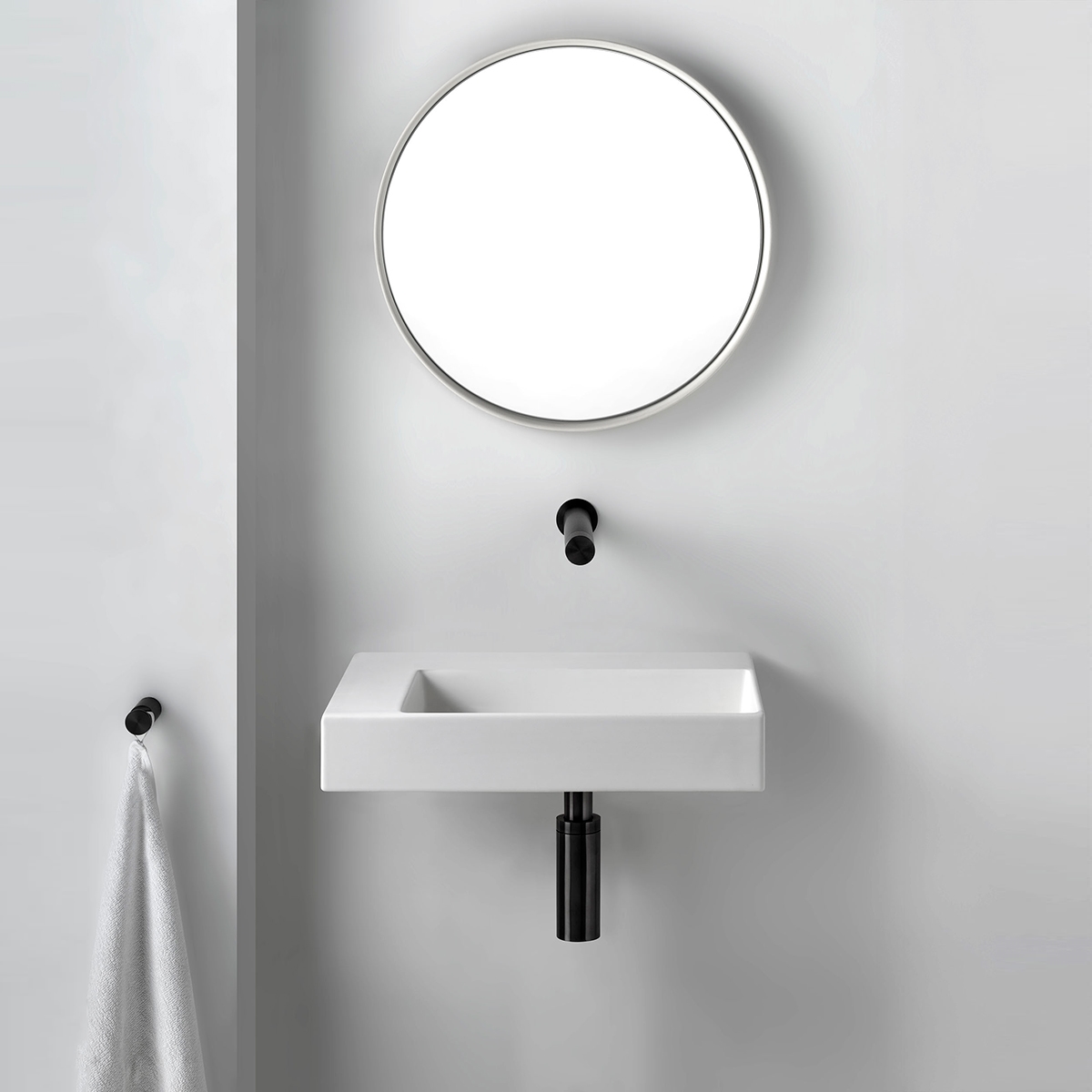 Designet er gennemtænkt helt ned til udløbet i håndvasken, hvor et skjult afløb fuldender det minimalistiske look.